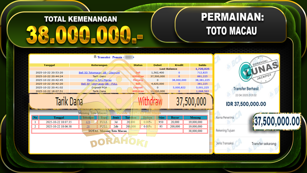 Bukti JP TOGEL TOTO MACAU 4D – ucapkan selamat kepada user id busxxx atas kemenangan di TOGEL TOTO MACAU 4D dengan total kemenangan Rp.38,000,000,- Yang pasti nya langsung LUNAS sesuai bukti ya bosku. Dorahoki nih bosku berapapun akan tetap kami bayar lunas ya bosku