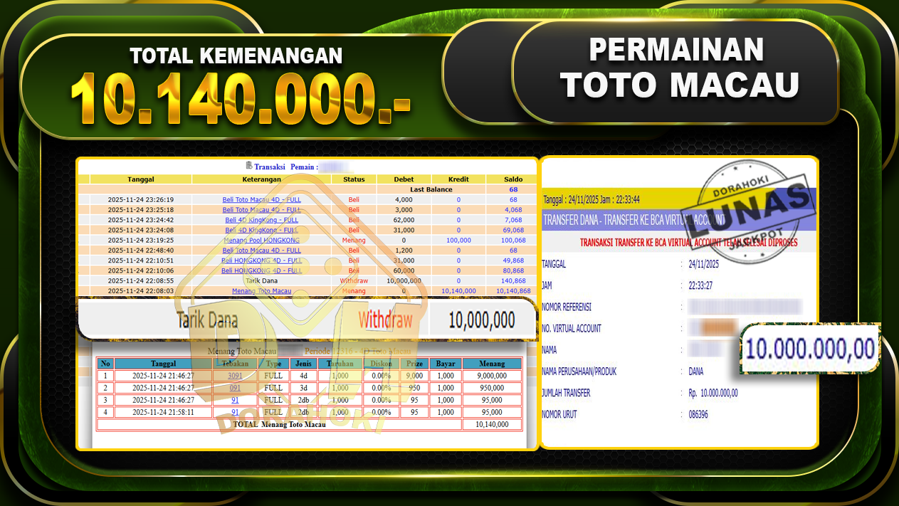 Bukti JP TOGEL TOTO MACAU 4D – ucapkan selamat kepada user id misxxx atas kemenangan di TOGEL TOTO MACAU 4D dengan total kemenangan Rp.10,140,000,- Yang pasti nya langsung LUNAS sesuai bukti ya bosku. Dorahoki nih bosku berapapun akan tetap kami bayar lunas ya bosku