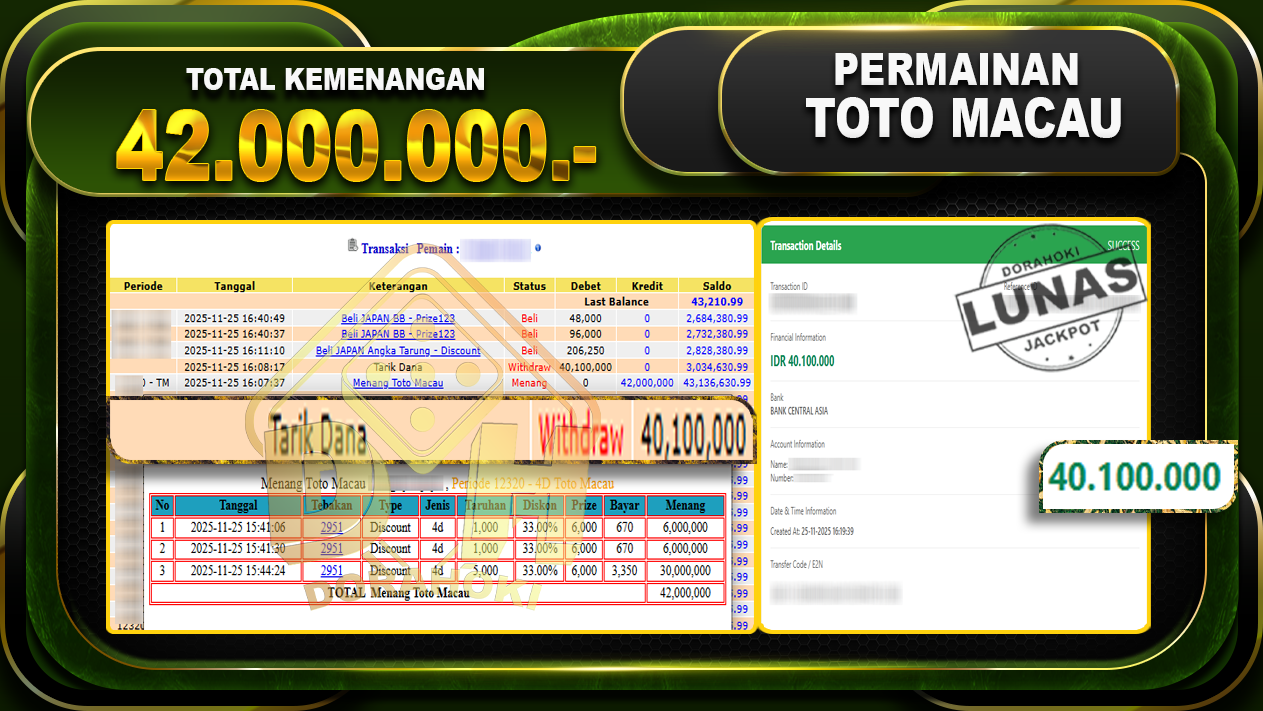 Bukti JP TOGEL TOTO MACAU 4D – ucapkan selamat kepada user id wanxxxxx atas kemenangan di TOGEL TOTO MACAU 4D dengan total kemenangan Rp.42,000,000,- Yang pasti nya langsung LUNAS sesuai bukti ya bosku. Dorahoki nih bosku berapapun akan tetap kami bayar lunas ya bosku