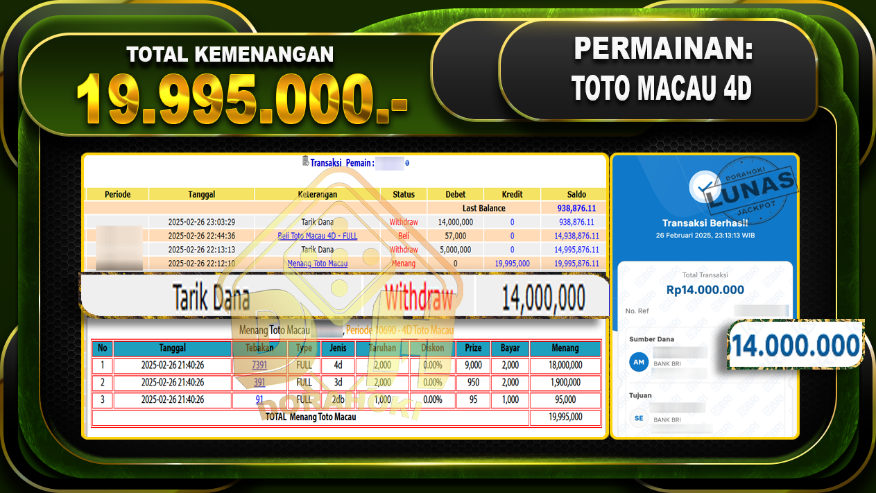 Bukti JP TOGEL TOTO MACAU 4D – ucapkan selamat kepada user id Tanxxx atas kemenangan di TOGEL TOTO MACAU 4D dengan total kemenangan Rp.19.995.000,- . Yang pasti nya langsung LUNAS sesuai bukti ya bosku. Dorahoki nih bosku berapapun akan tetap kami bayar lunas ya bosku.