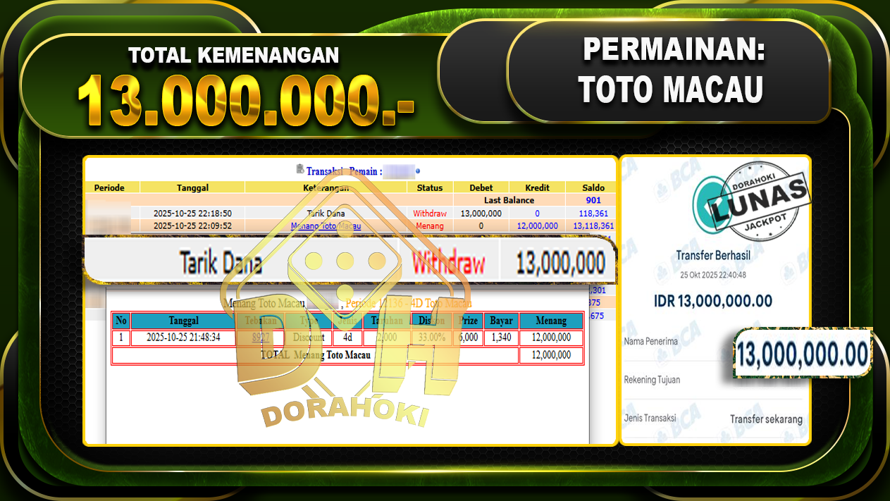 Bukti JP TOGEL TOTO MACAU 4D – ucapkan selamat kepada user id olexxxxx atas kemenangan di TOGEL TOTO MACAU 4D dengan total kemenangan Rp.13,000,000,- Yang pasti nya langsung LUNAS sesuai bukti ya bosku. Dorahoki nih bosku berapapun akan tetap kami bayar lunas ya bosku