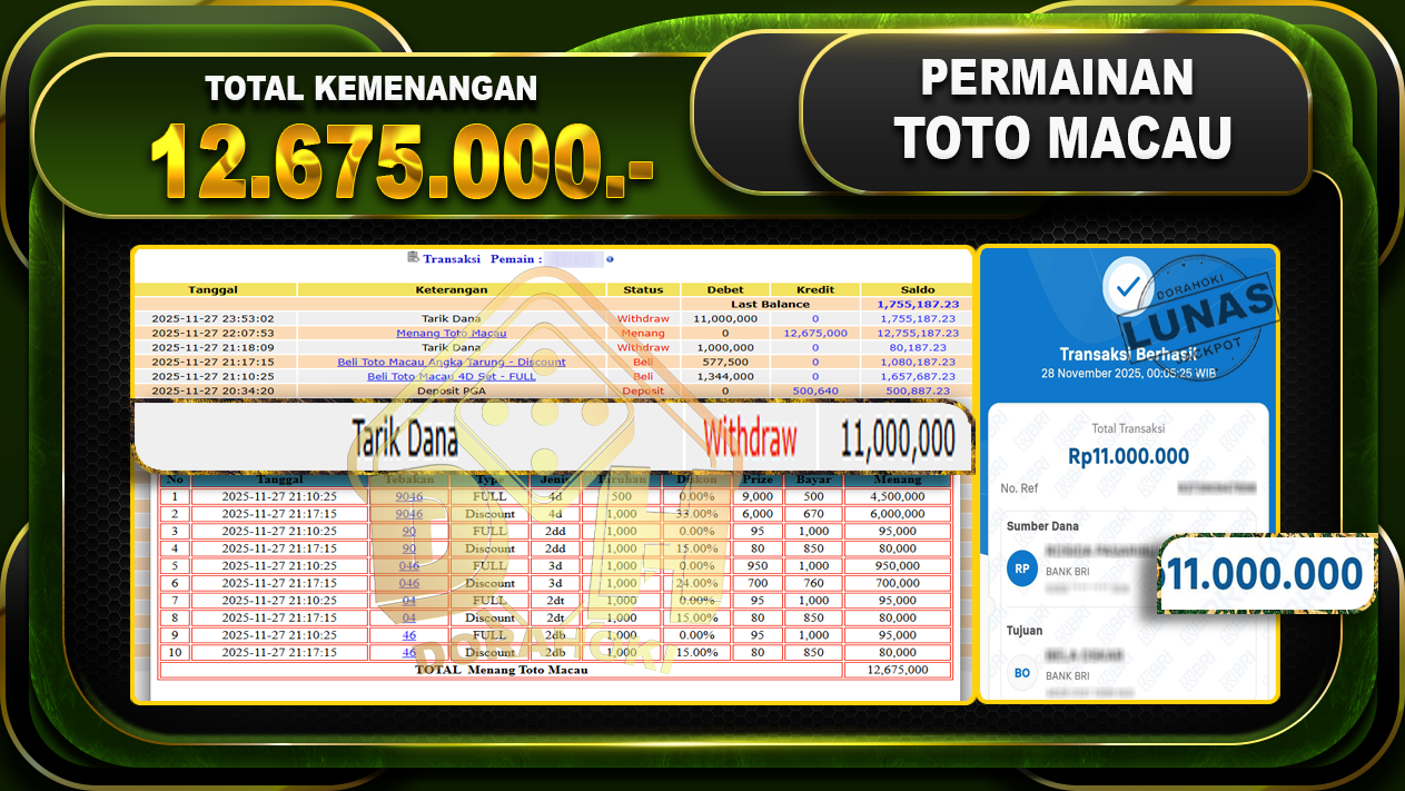 Bukti JP TOGEL TOTO MACAU 4D – ucapkan selamat kepada user id belxxxxx atas kemenangan di TOGEL TOTO MACAU 4D dengan total kemenangan Rp.12,675,000,- Yang pasti nya langsung LUNAS sesuai bukti ya bosku. Dorahoki nih bosku berapapun akan tetap kami bayar lunas ya bosku
