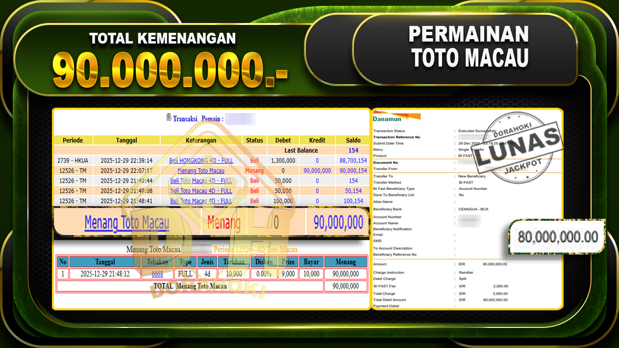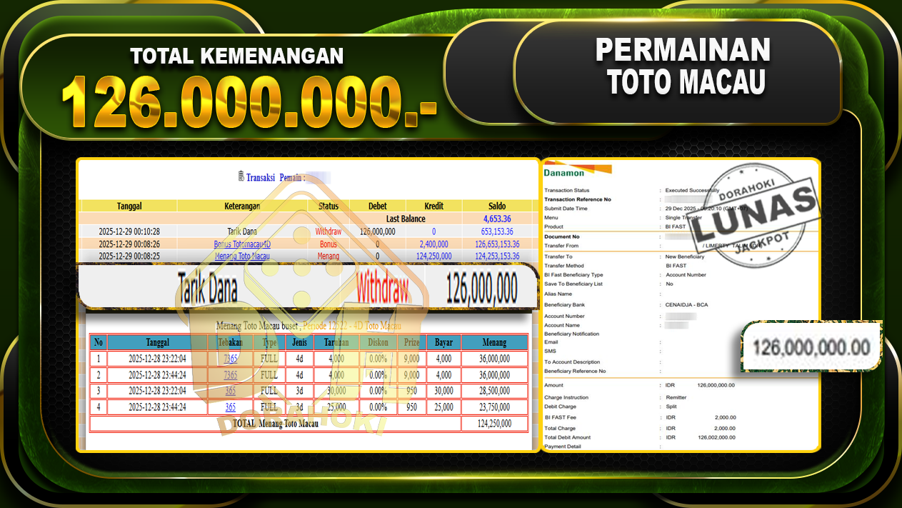 Bukti JP TOGEL TOTO MACAU 4D – ucapkan selamat kepada user id busxxx atas kemenangan di TOGEL TOTO MACAU 4D dengan total kemenangan Rp.126.000.000,- Yang pasti nya langsung LUNAS sesuai bukti ya bosku. Dorahoki nih bosku berapapun akan tetap kami bayar lunas ya bosku
