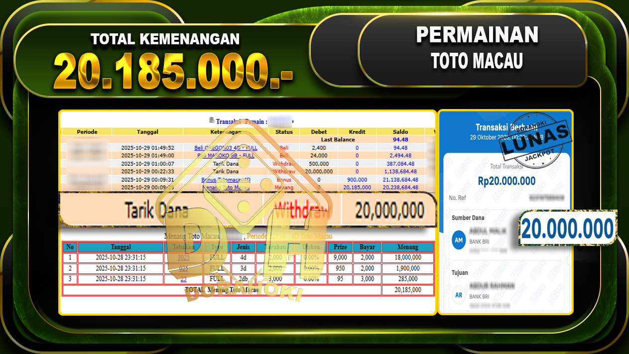 Bukti JP TOGEL TOTO MACAU 4D – ucapkan selamat kepada user id manxxx atas kemenangan di TOGEL TOTO MACAU 4D dengan total kemenangan Rp.20,185,000,- Yang pasti nya langsung LUNAS sesuai bukti ya bosku. Dorahoki nih bosku berapapun akan tetap kami bayar lunas ya bosku