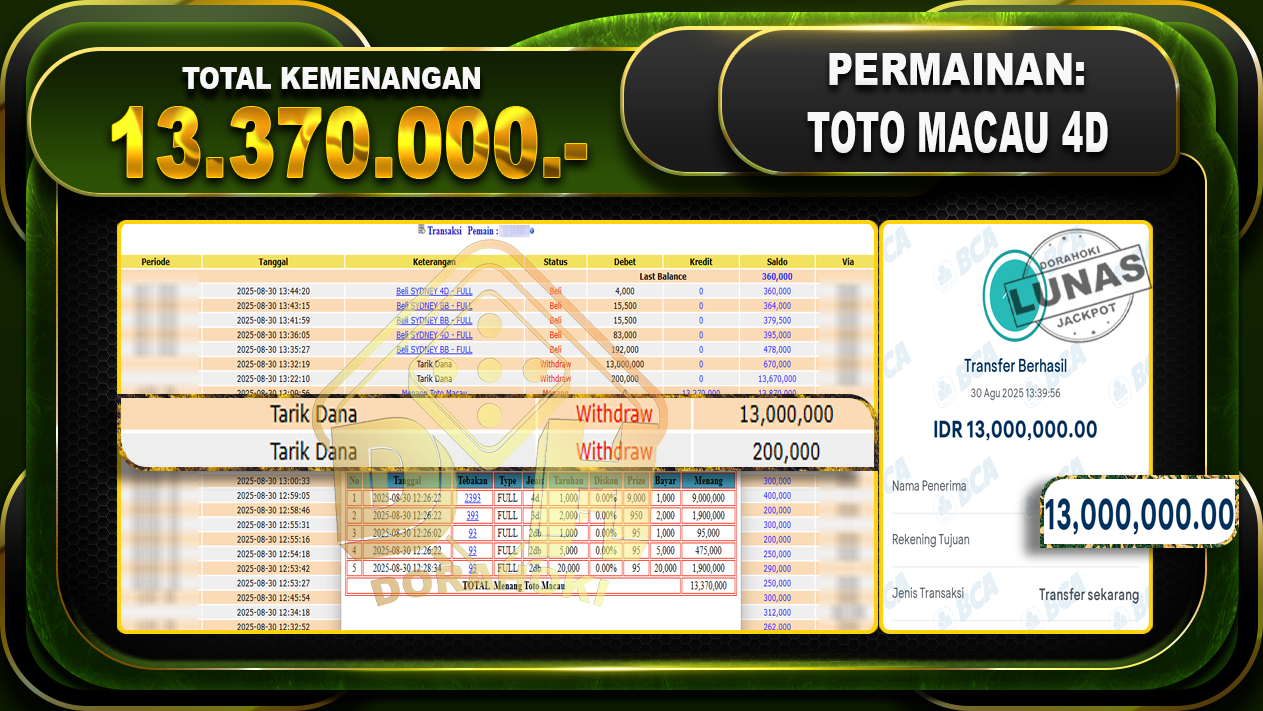 Bukti JP TOGEL TOTO MACAU 4D – ucapkan selamat kepada user id Nayxx atas kemenangan di TOGEL TOTO MACAU 4D dengan total kemenangan Rp.13,370,000,- Yang pasti nya langsung LUNAS sesuai bukti ya bosku. Dorahoki nih bosku berapapun akan tetap kami bayar lunas ya bosku