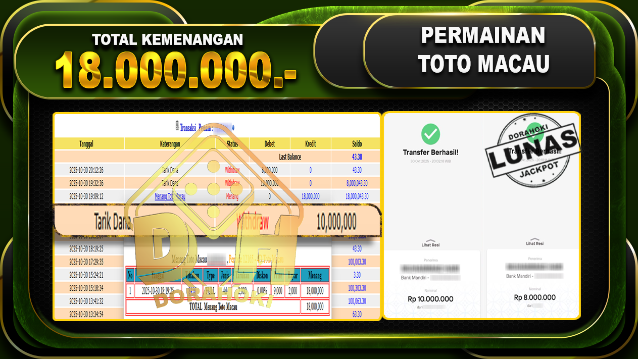 Bukti JP TOGEL TOTO MACAU 4D – ucapkan selamat kepada user id squxxxx atas kemenangan di  TOGEL TOTO MACAU 4D dengan total kemenangan Rp.18,000,000,- Yang pasti nya langsung LUNAS sesuai bukti ya bosku. Dorahoki nih bosku berapapun akan tetap kami bayar lunas ya bosku