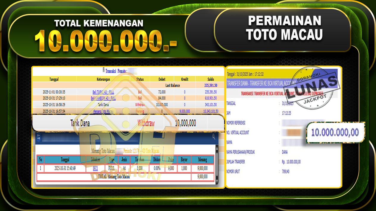 Bukti JP TOGEL TOTO MACAU 4D – ucapkan selamat kepada user id yosxx atas kemenangan di  TOGEL TOTO MACAU 4D dengan total kemenangan Rp.10,000,000,- Yang pasti nya langsung LUNAS sesuai bukti ya bosku. Dorahoki nih bosku berapapun akan tetap kami bayar lunas ya bosku