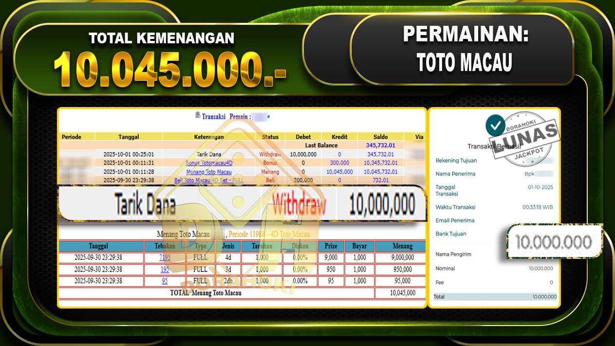 Bukti JP TOGEL TOTO MACAU – ucapkan selamat kepada user id mtxxx atas kemenangan di TOGEL TOTO MACAU dengan total kemenangan Rp.10,045,000,- Yang pasti nya langsung LUNAS sesuai bukti ya bosku. Dorahoki nih bosku berapapun akan tetap kami bayar lunas ya bosku