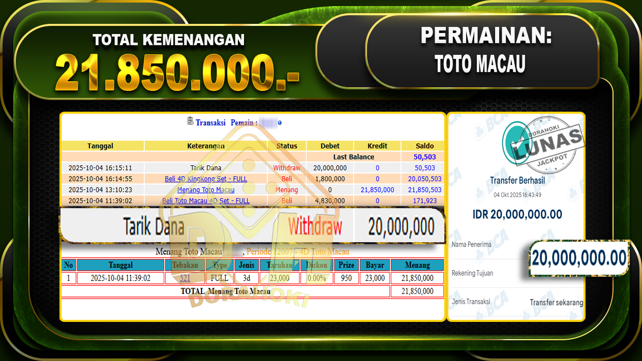 Bukti JP TOGEL TOTO MACAU – ucapkan selamat kepada user id busxxxxx atas kemenangan di TOGEL TOTO MACAU dengan total kemenangan Rp.21,850,000,- Yang pasti nya langsung LUNAS sesuai bukti ya bosku. Dorahoki nih bosku berapapun akan tetap kami bayar lunas ya bosku