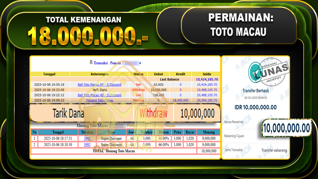 Bukti JP TOGEL TOTO MACAU  – ucapkan selamat kepada user id mimxxxxx atas kemenangan di  TOGEL TOTO MACAU  dengan total kemenangan Rp.18,000,000,- Yang pasti nya langsung LUNAS sesuai bukti ya bosku. Dorahoki nih bosku berapapun akan tetap kami bayar lunas ya bosku