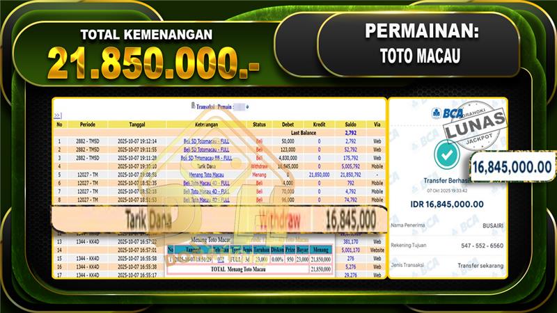Bukti JP TOGEL TOTO MACAU – ucapkan selamat kepada user id Busxxxxx atas kemenangan di TOGEL TOTO MACAU dengan total kemenangan Rp.21,850,000,- Yang pasti nya langsung LUNAS sesuai bukti ya bosku. Dorahoki nih bosku berapapun akan tetap kami bayar lunas ya bosku