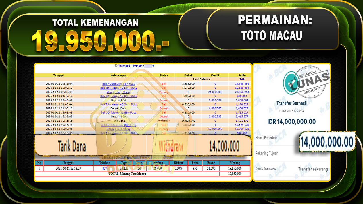Bukti JP TOGEL TOTO MACAU – ucapkan selamat kepada user id busxxx atas kemenangan di TOGEL TOTO MACAU dengan total kemenangan Rp.19,950,000,- Yang pasti nya langsung LUNAS sesuai bukti ya bosku. Dorahoki nih bosku berapapun akan tetap kami bayar lunas ya bosku