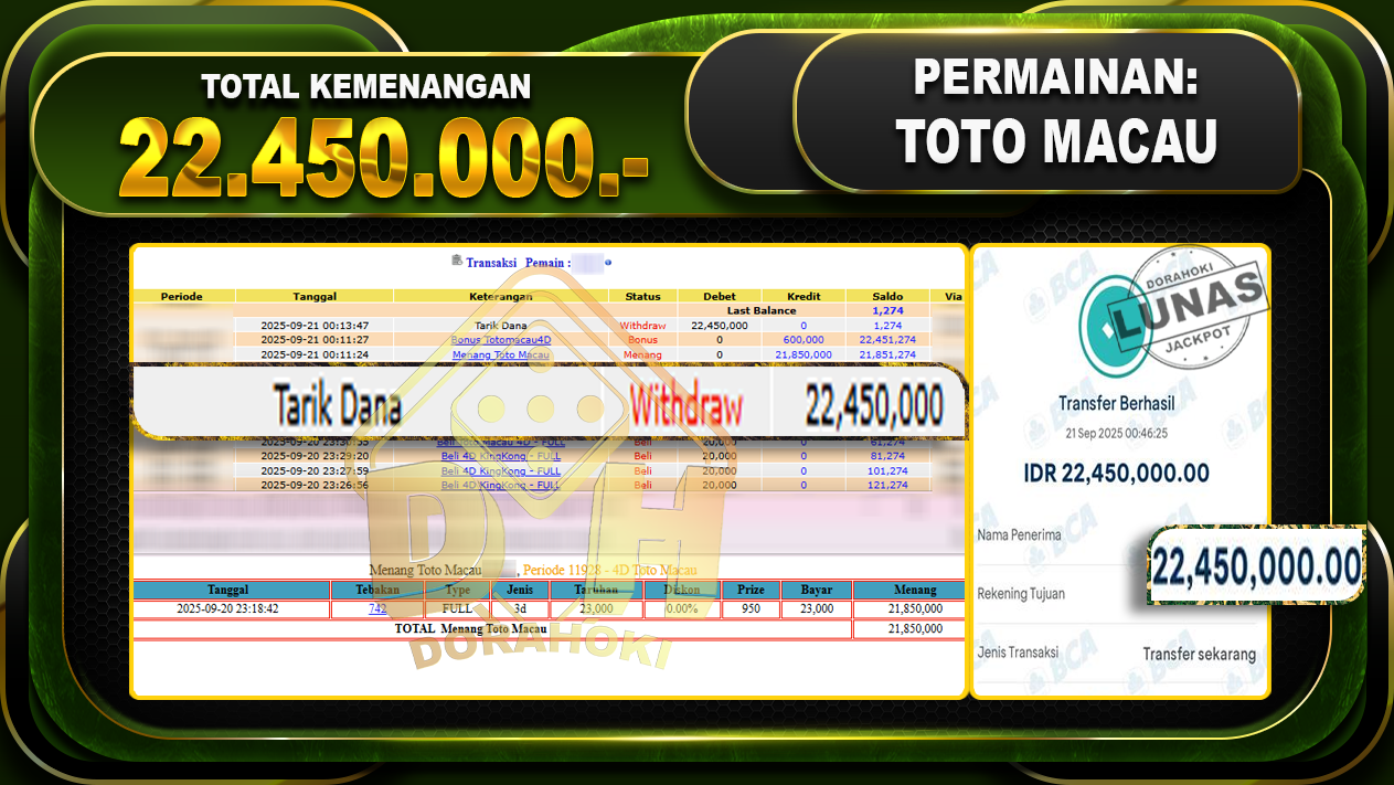 Bukti JP TOGEL TOTO MACAU – ucapkan selamat kepada user id Buxxxx atas kemenangan di TOGEL TOTO MACAU dengan total kemenangan Rp.22,450,000,- Yang pasti nya langsung LUNAS sesuai bukti ya bosku. Dorahoki nih bosku berapapun akan tetap kami bayar lunas ya bosku