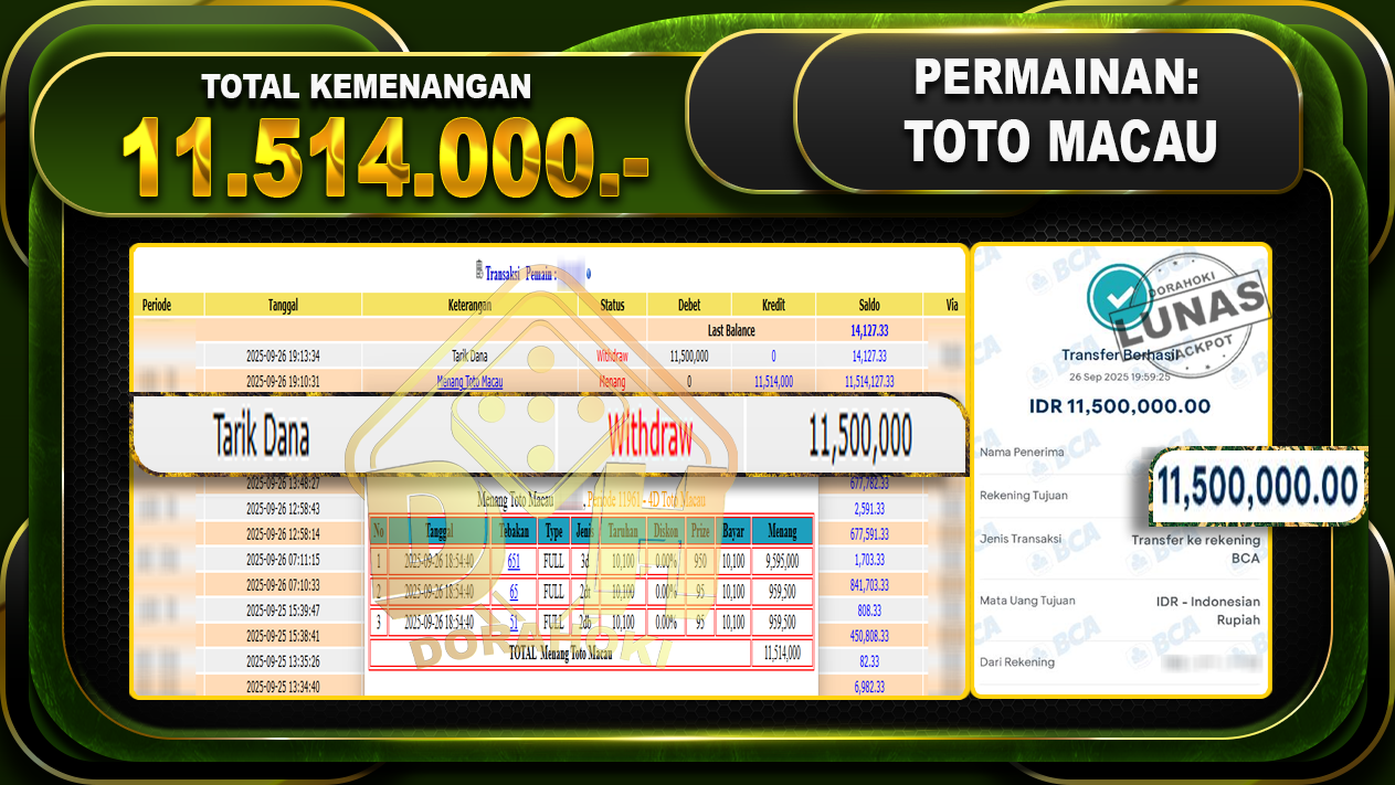 Bukti JP TOGEL TOTO MACAU – ucapkan selamat kepada user id harxxxx atas kemenangan di TOGEL TOTO MACAU dengan total kemenangan Rp.11,514,000,- Yang pasti nya langsung LUNAS sesuai bukti ya bosku. Dorahoki nih bosku berapapun akan tetap kami bayar lunas ya bosku