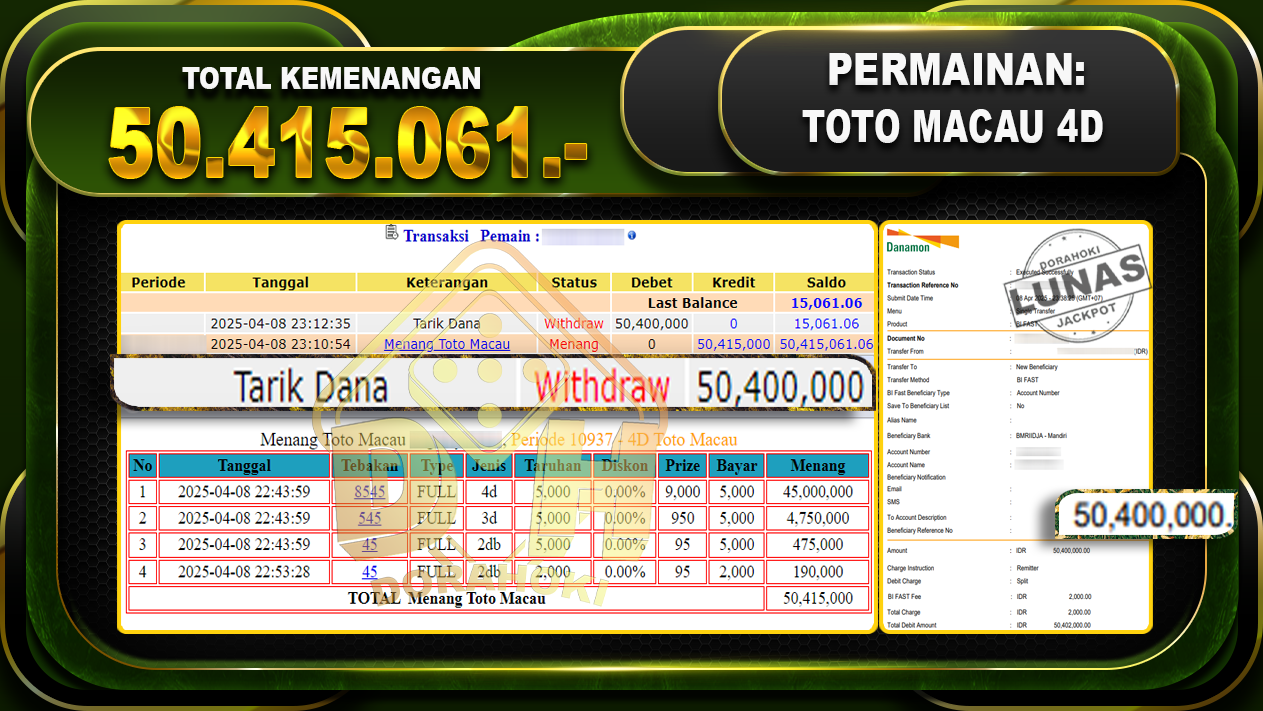 Bukti JP TOGEL TOTOMACAU 4D – ucapkan selamat kepada user id Sugxxx atas kemenangan di TOGEL TOTOMACAU 4D dengan total kemenangan Rp.50.415.061,- . Yang pasti nya langsung LUNAS sesuai bukti ya bosku. Dorahoki nih bosku berapapun akan tetap kami bayar lunas ya bosku.