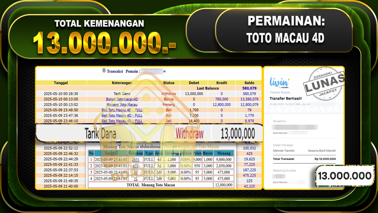 Bukti JP TOGEL TOTOMACAU 4D – ucapkan selamat kepada user id Abdxxx atas kemenangan di TOGEL TOTOMACAU 4D dengan total kemenangan Rp.13.000.000,- . Yang pasti nya langsung LUNAS sesuai bukti ya bosku. Dorahoki nih bosku berapapun akan tetap kami bayar lunas ya bosku.
