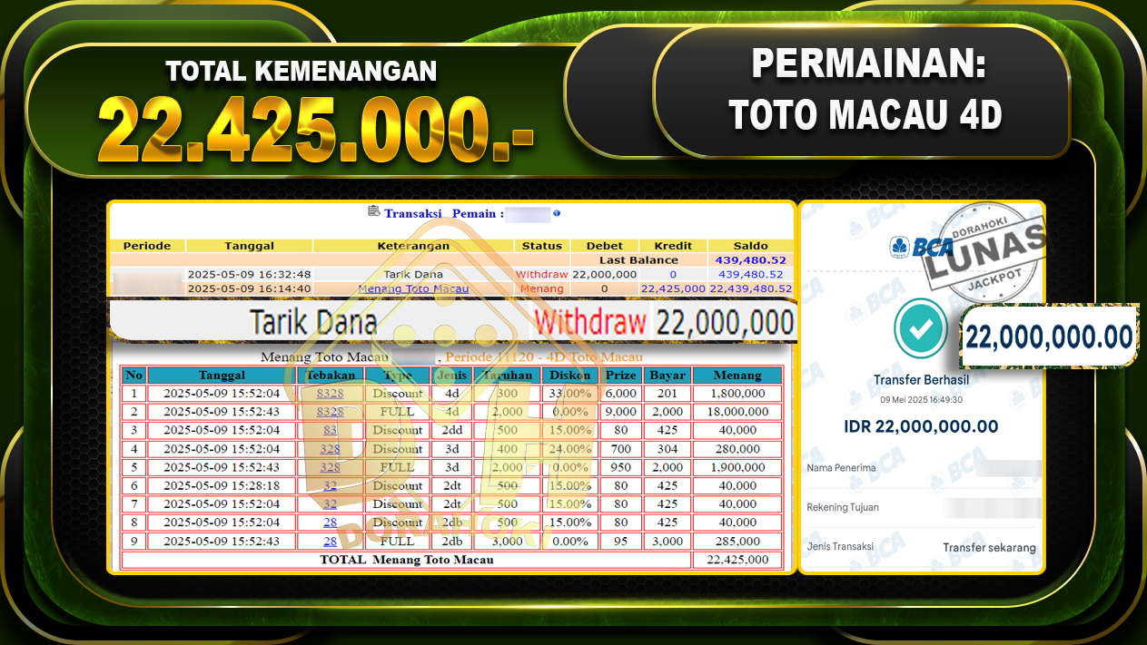 Bukti JP TOGEL TOTOMACAU 4D – ucapkan selamat kepada user id Rudxxx atas kemenangan di TOGEL TOTOMACAU 4D dengan total kemenangan Rp.22.425.000,- . Yang pasti nya langsung LUNAS sesuai bukti ya bosku. Dorahoki nih bosku berapapun akan tetap kami bayar lunas ya bosku.