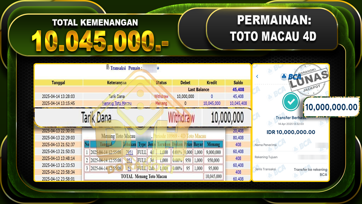 Bukti JP TOGEL TOTOMACAU 4D – ucapkan selamat kepada user id Yukxxx atas kemenangan di TOGEL TOTOMACAU 4D dengan total kemenangan Rp.10.045.000,- . Yang pasti nya langsung LUNAS sesuai bukti ya bosku. Dorahoki nih bosku berapapun akan tetap kami bayar lunas ya bosku.