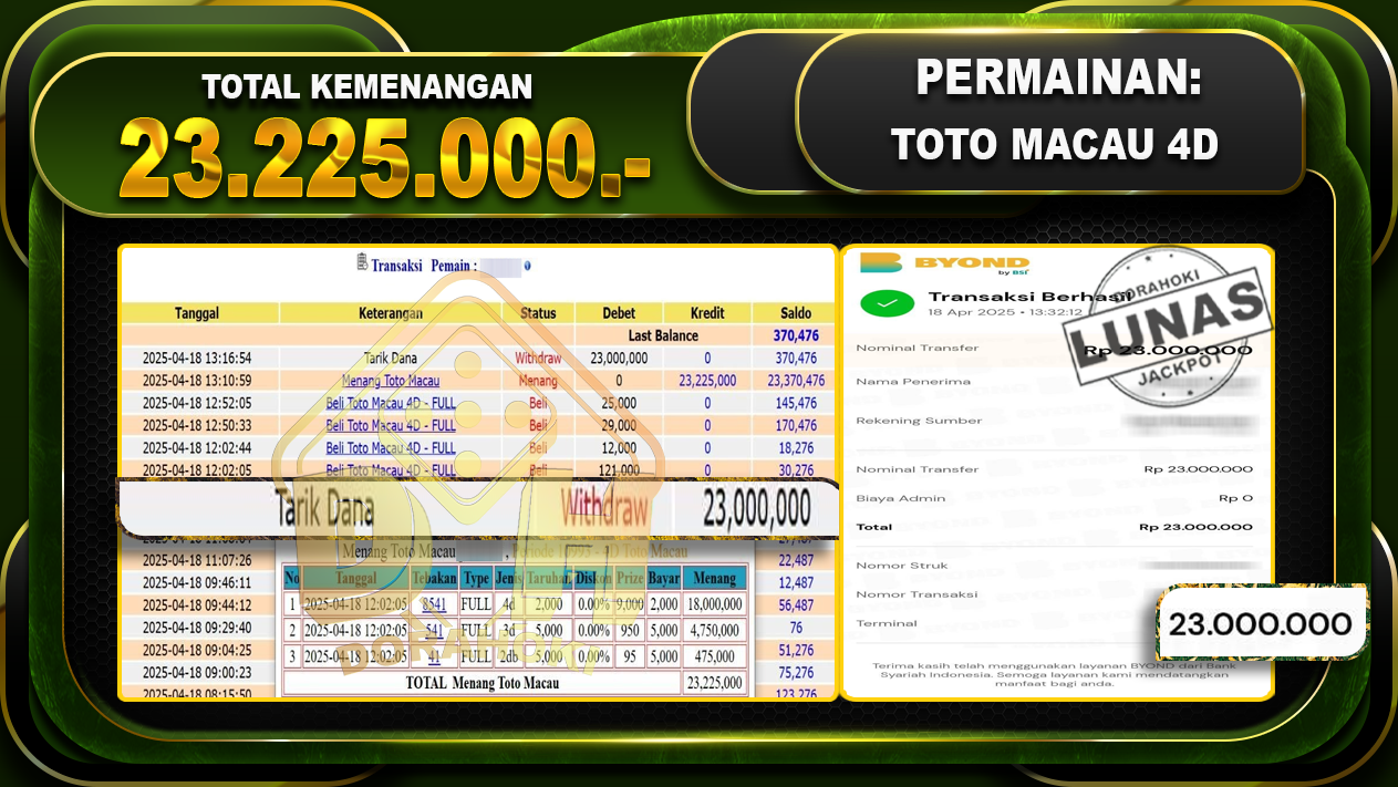 Bukti JP TOGEL TOTOMACAU 4D – ucapkan selamat kepada user id Panxxx atas kemenangan di TOGEL TOTOMACAU 4D dengan total kemenangan Rp.23.225.000,- . Yang pasti nya langsung LUNAS sesuai bukti ya bosku. Dorahoki nih bosku berapapun akan tetap kami bayar lunas ya bosku.