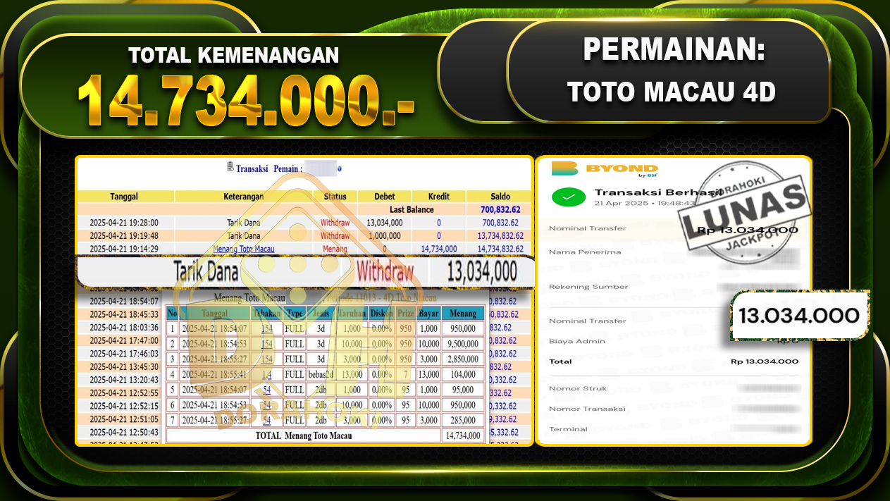 Bukti JP TOGEL TOTOMACAU 4D – ucapkan selamat kepada user id Achxxx atas kemenangan di TOGEL TOTOMACAU 4D dengan total kemenangan Rp.14.734.000,- . Yang pasti nya langsung LUNAS sesuai bukti ya bosku. Dorahoki nih bosku berapapun akan tetap kami bayar lunas ya bosku.