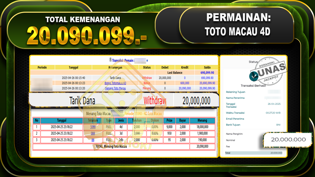 Bukti JP TOGEL TOTOMACAU 4D – ucapkan selamat kepada user id Akoxxx atas kemenangan di TOGEL TOTOMACAU 4D dengan total kemenangan Rp.20.090.099,- . Yang pasti nya langsung LUNAS sesuai bukti ya bosku. Dorahoki nih bosku berapapun akan tetap kami bayar lunas ya bosku.
