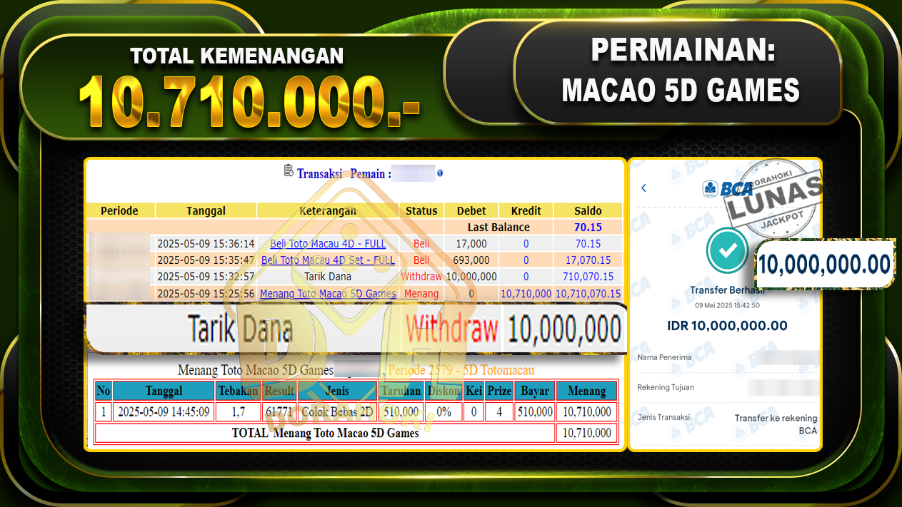Bukti JP TOGEL TOTOMACAU 5D – ucapkan selamat kepada user id Sagxxx atas kemenangan di TOGEL TOTOMACAU 5D dengan total kemenangan Rp.10.710.000,- . Yang pasti nya langsung LUNAS sesuai bukti ya bosku. Dorahoki nih bosku berapapun akan tetap kami bayar lunas ya bosku.