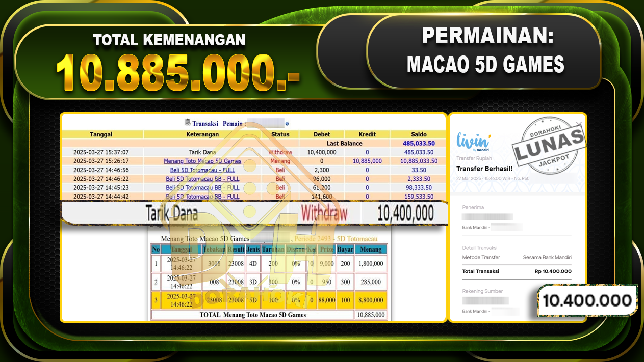 Bukti JP TOGEL TOTOMACAU 5D – ucapkan selamat kepada user id Dorxxx atas kemenangan di TOGEL TOTOMACAU 5D dengan total kemenangan Rp.10.885.000,- . Yang pasti nya langsung LUNAS sesuai bukti ya bosku. Dorahoki nih bosku berapapun akan tetap kami bayar lunas ya bosku.