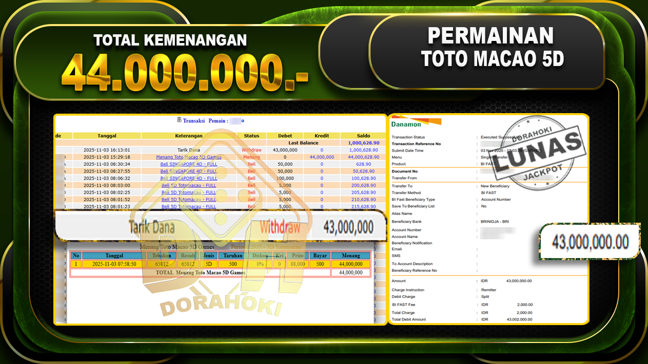 Bukti JP TOGEL Toto Macao 5D Games – ucapkan selamat kepada user id acox atas kemenangan di TOGEL Toto Macao 5D Games dengan total kemenangan Rp.44.000.000,- Yang pasti nya langsung LUNAS sesuai bukti ya bosku. Dorahoki nih bosku berapapun akan tetap kami bayar lunas ya bosku.