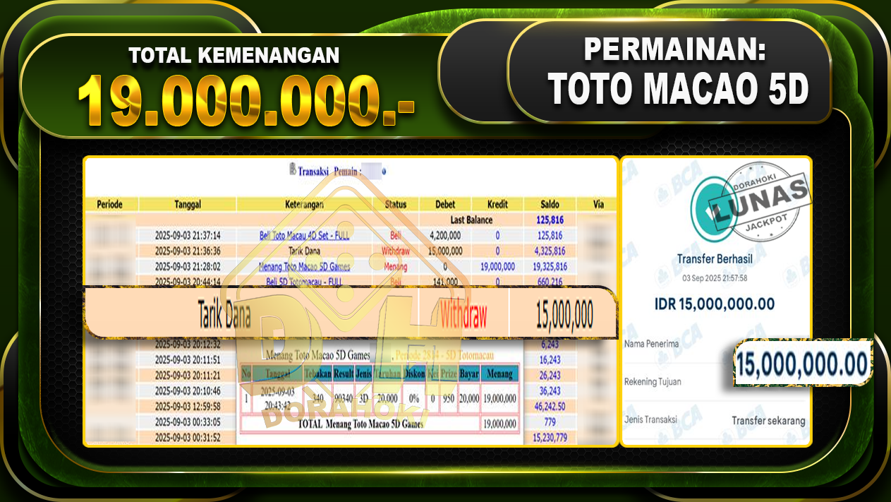 Bukti JP TOGEL Toto Macao 5D Games – ucapkan selamat kepada user id BuXXX atas kemenangan di TOGEL Toto Macao 5D Games dengan total kemenangan Rp.19.000.000,- Yang pasti nya langsung LUNAS sesuai bukti ya bosku. Dorahoki nih bosku berapapun akan tetap kami bayar lunas ya bosku.