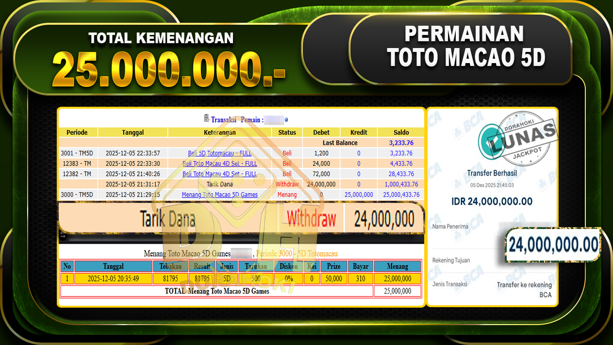 Bukti JP TOGEL Toto Macao 5D Games – ucapkan selamat kepada user id bbyxxx atas kemenangan di TOGEL Toto Macao 5D Games dengan total kemenangan Rp.25.000.000,- Yang pasti nya langsung LUNAS sesuai bukti ya bosku. Dorahoki nih bosku berapapun akan tetap kami bayar lunas ya bosku.
