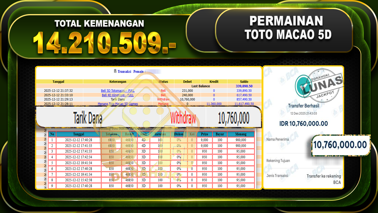 Bukti JP TOGEL Toto Macao 5D Games – ucapkan selamat kepada user id tosxxxx atas kemenangan di TOGEL Toto Macao 5D Games dengan total kemenangan Rp.14.210.509,- Yang pasti nya langsung LUNAS sesuai bukti ya bosku. Dorahoki nih bosku berapapun akan tetap kami bayar lunas ya bosku.