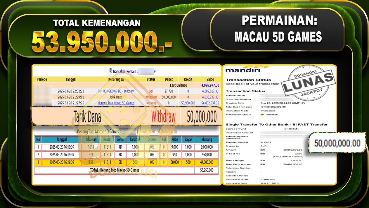 Bukti JP TOTO MACAU 5D – ucapkan selamat kepada user id Yonxxx atas kemenangan di  TOTO MACAU 5D  dengan total kemenangan Rp.53.950.000,- . Yang pasti nya langsung LUNAS sesuai bukti ya bosku. Dorahoki nih bosku berapapun akan tetap kami bayar lunas ya bosku.