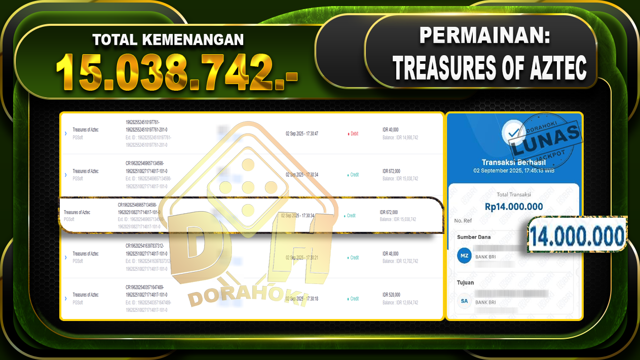 Bukti JP Treasures of Aztec- ucapkan selamat kepada user id Babxxx atas kemenangan di Treasures of Aztec dengan total kemenangan Rp.15.038.742,- . Yang pasti nya langsung LUNAS sesuai bukti ya bosku. Dorahoki nih bosku berapapun akan tetap kami bayar lunas ya bosku.