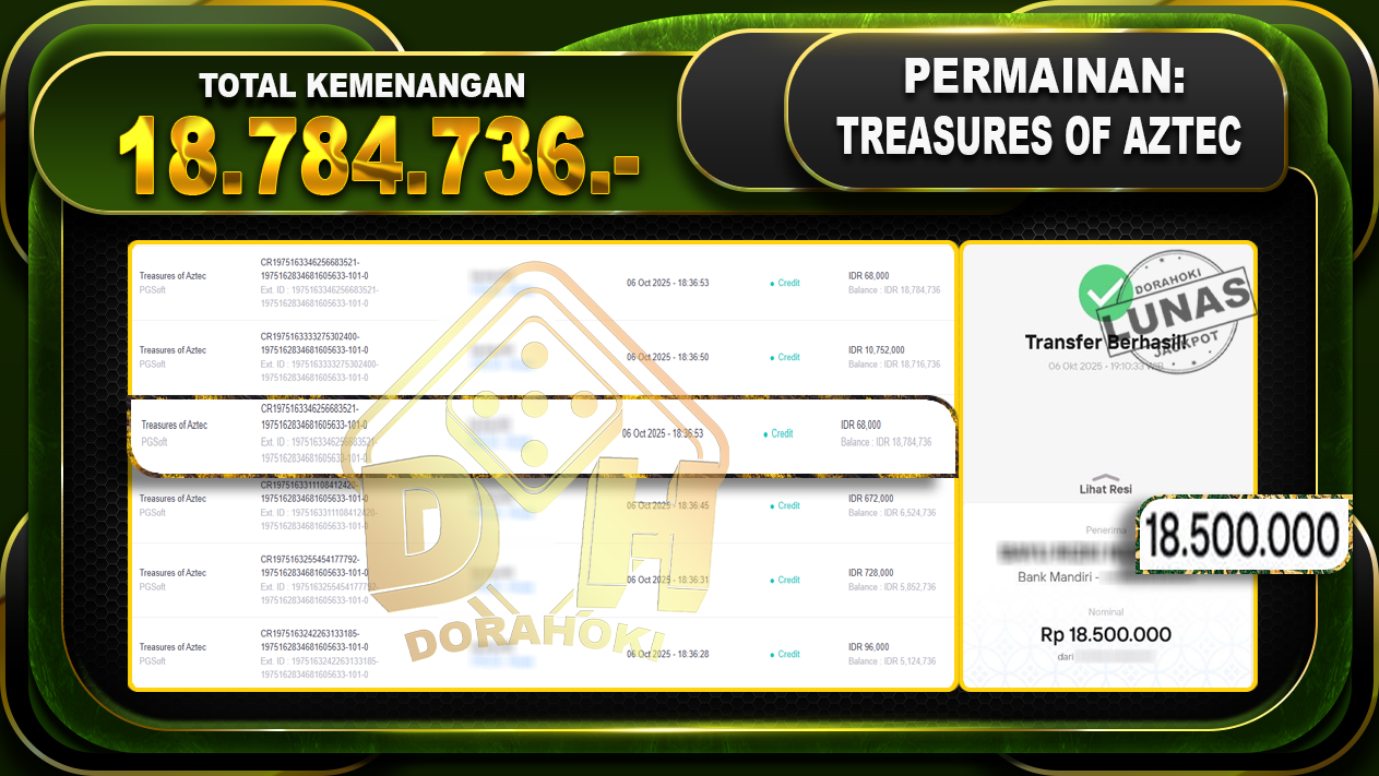 Bukti JP Treasures of Aztec- ucapkan selamat kepada user id kipxxxxx atas kemenangan di Treasures of Aztec  dengan total kemenangan Rp.18.784.736,- . Yang pasti nya langsung LUNAS sesuai bukti ya bosku. Dorahoki nih bosku berapapun akan tetap kami bayar lunas ya bosku.