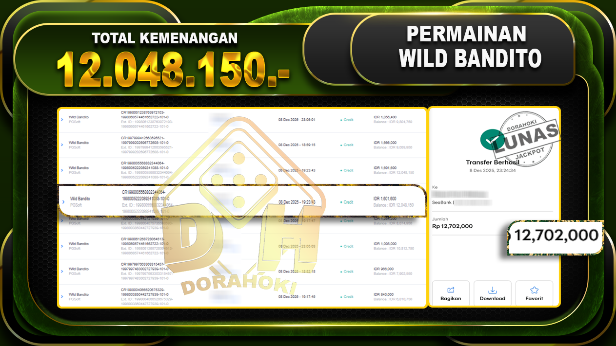 Bukti JP Wild Bandito – ucapkan selamat kepada user id rhaxxxxx atas kemenangan di Wild Bandito dengan total kemenangan Rp.12.048.150.-  Yang pasti nya langsung LUNAS sesuai bukti ya bosku. Dorahoki nih bosku berapapun akan tetap kami bayar lunas ya bosku.