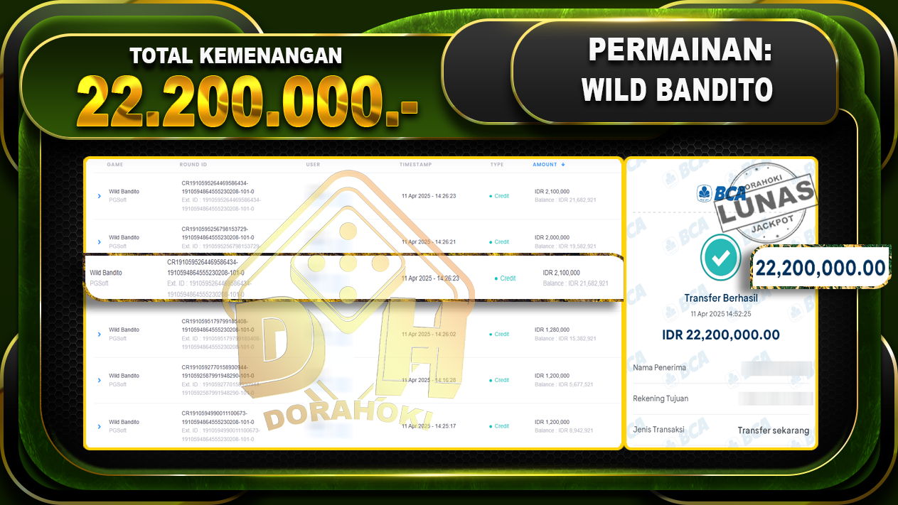 Bukti JP WILD BANDITO – ucapkan selamat kepada user id Rutxxx atas kemenangan di WILD BANDITO dengan total kemenangan Rp.22.200.000,- . Yang pasti nya langsung LUNAS sesuai bukti ya bosku. Dorahoki nih bosku berapapun akan tetap kami bayar lunas ya bosku.
