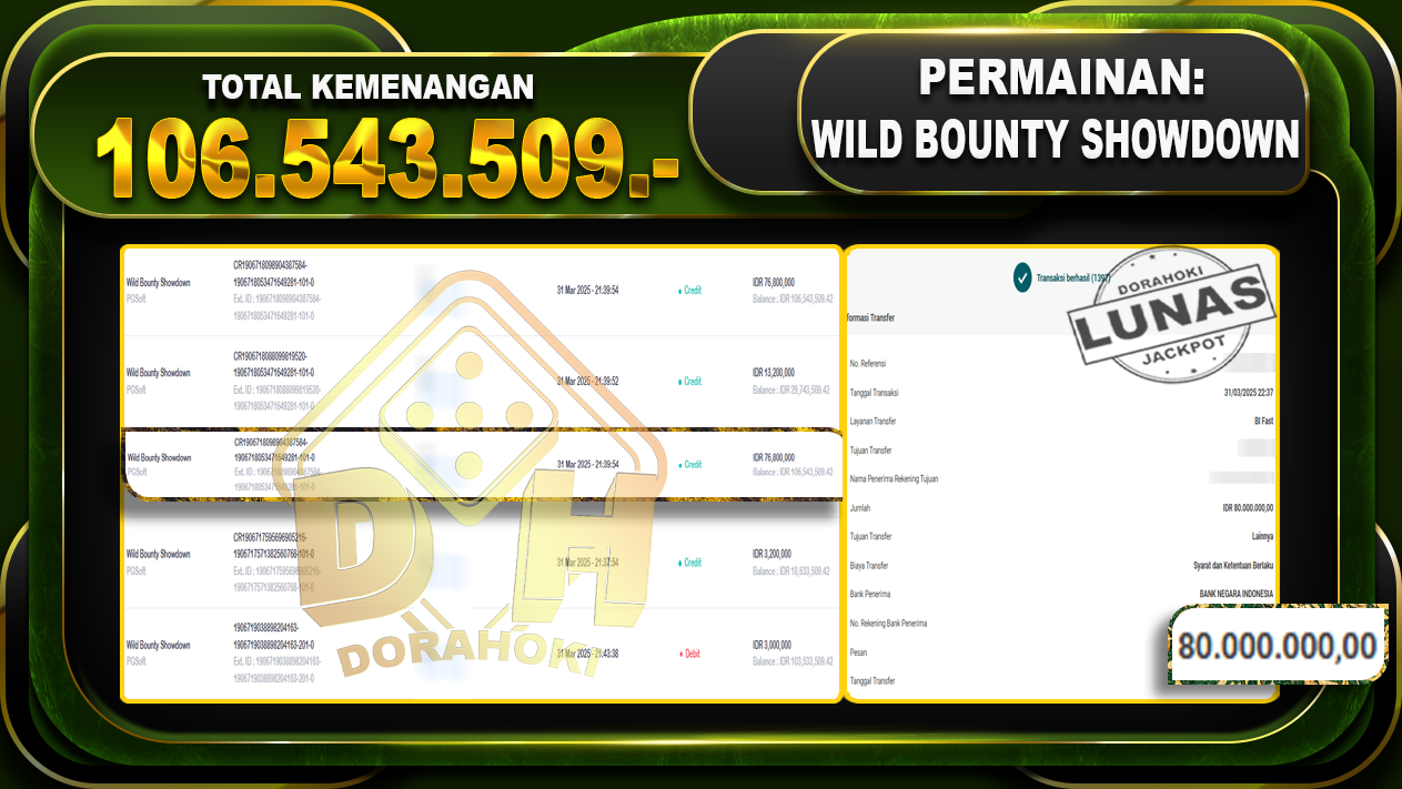 Bukti JP WILD BOUNTY SHOWDOWN – ucapkan selamat kepada user id Jitxxx atas kemenangan di  WILD BOUNTY SHOWDOWN dengan total kemenangan Rp.106.543.509,- . Yang pasti nya langsung LUNAS sesuai bukti ya bosku. Dorahoki nih bosku berapapun akan tetap kami bayar lunas ya bosku.