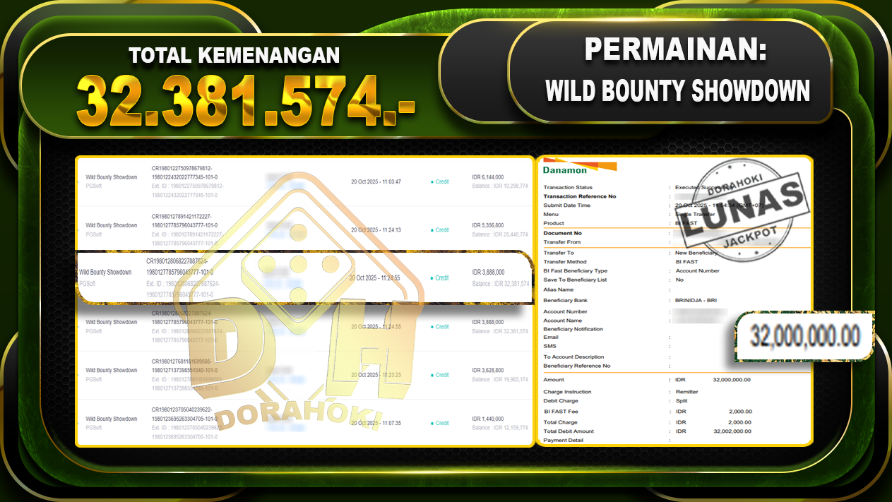 Bukti JP Wild Bounty Showdown – ucapkan selamat kepada user id setaxxxxxx atas kemenangan di Wild Bounty Showdown dengan total kemenangan Rp.32.381.574,- Yang pasti nya langsung LUNAS sesuai bukti ya bosku. Dorahoki nih bosku berapapun akan tetap kami bayar lunas ya bosku