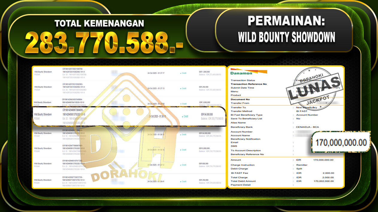 Bukti JP Wild Bounty Showdown – ucapkan selamat kepada user id rikxxx atas kemenangan di Wild Bounty Showdown dengan total kemenangan Rp.283.770.588,- Yang pasti nya langsung LUNAS sesuai bukti ya bosku. Dorahoki nih bosku berapapun akan tetap kami bayar lunas ya bosku