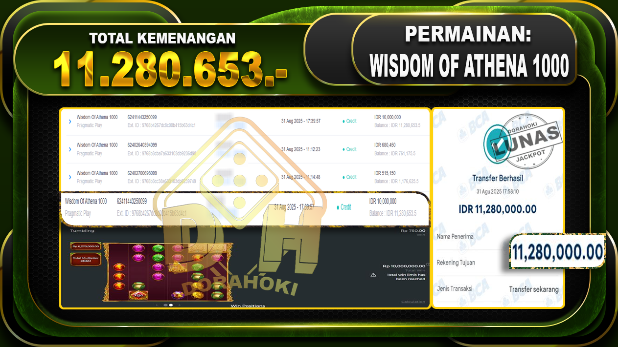Bukti JP Wisdom Of Athena 1000 – ucapkan selamat kepada user id Senxxxx atas kemenangan di  Wisdom Of Athena 1000 dengan total kemenangan Rp.11.280.653,- Yang pasti nya langsung LUNAS sesuai bukti ya bosku. Dorahoki nih bosku berapapun akan tetap kami bayar lunas ya bosku